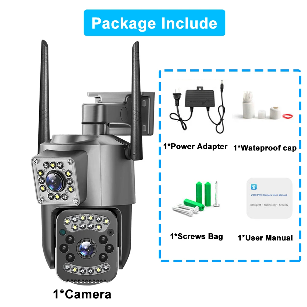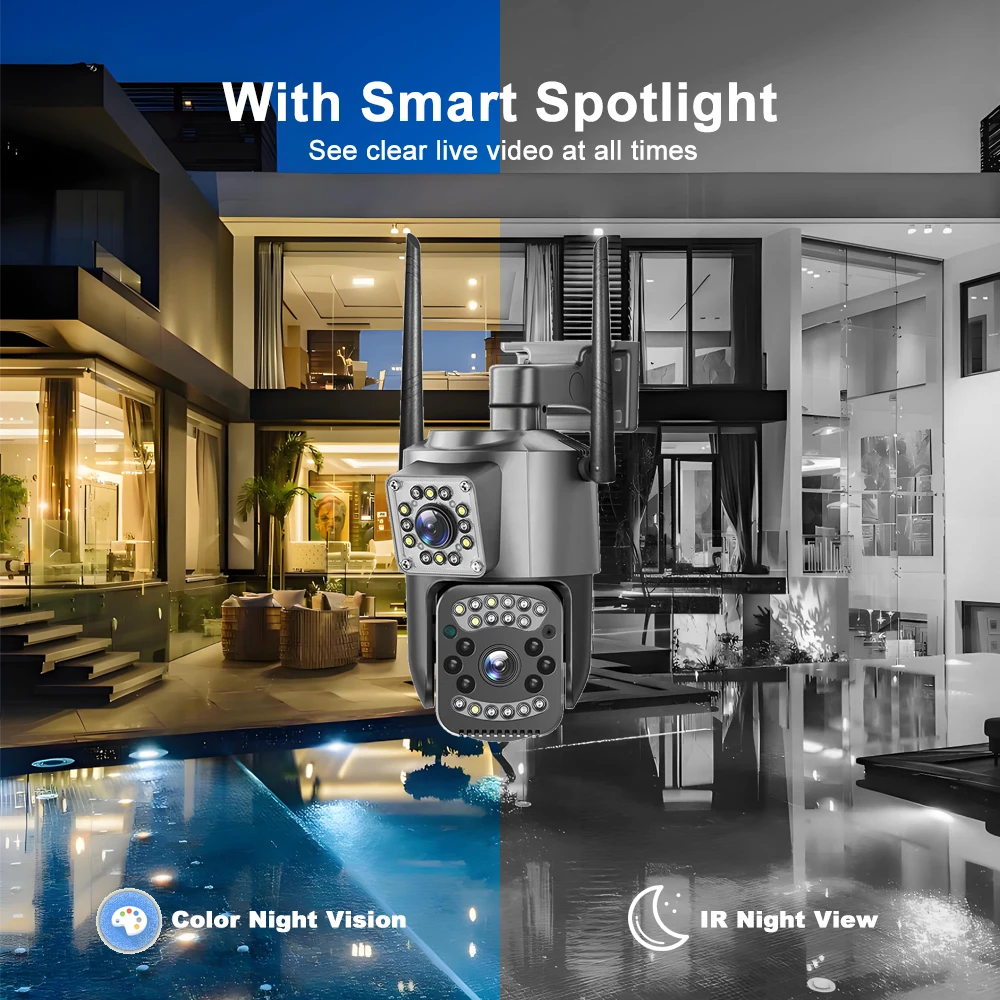 - La cámara está equipada con dos lentes que ofrecen una visión panorámica completa, eliminando puntos ciegos y proporcionando una cobertura de 360 grados.