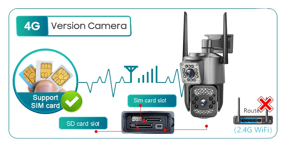 La cámara 4G solo admite conexión de tarjeta SIM 4G, ranura para tarjeta SD integrada y ranura para tarjeta SIM.
